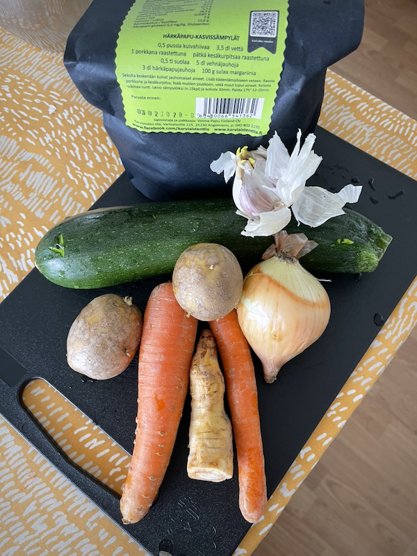 Koska keitto on pääosin kasviskeitto eikä perinteinen lihasattumilla valmistettu, niin lihansyöjille paistoin pannulla pekonisilppua, jota voi lisätä omaan annokseensa.