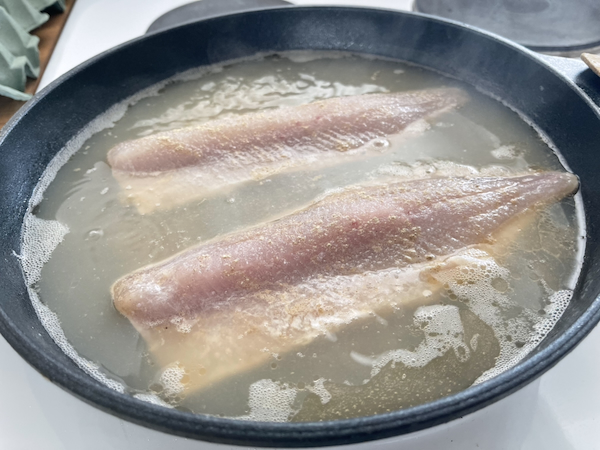Siiat maustoin ohjeen mukaan suolalla ja valkopippurilla. Kun liemi oli kiehahtanut, asetin kalafileet pannulle.
