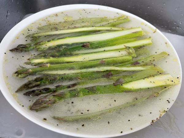 Pääsiäisen lounaalta jäi alkoholitonta valkoviiniä. Olin jo aikaisemmin ajatellut että pitää se loppu hyötykäyttää johonkin. Resepti osui siis hyvään saumaan. Parsaakin oli jäänyt kaappiin odottamaan käyttöä.