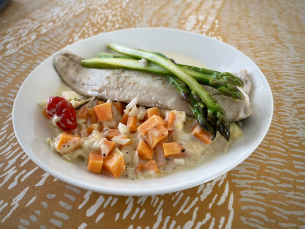 Alkuperäisessä ohjeessa oli lisukkeena parsaa. Vähän mukaelin ja oikaisin, vähän nolostikin verrattuna alkuperäiseen ohjeeseen.